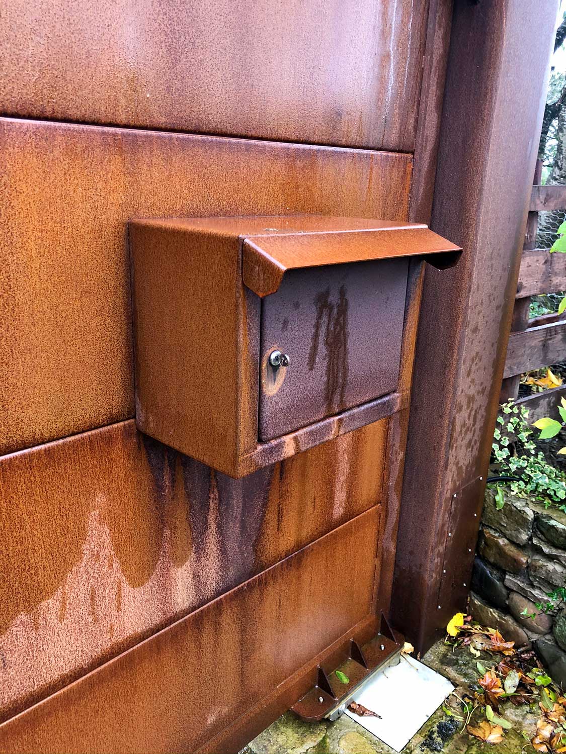 The pillars on either side of the gate are again oversized, acting as sentinels. An oversized letterbox to the rear of the gate eases mail collection. It gives the gate yet another function.