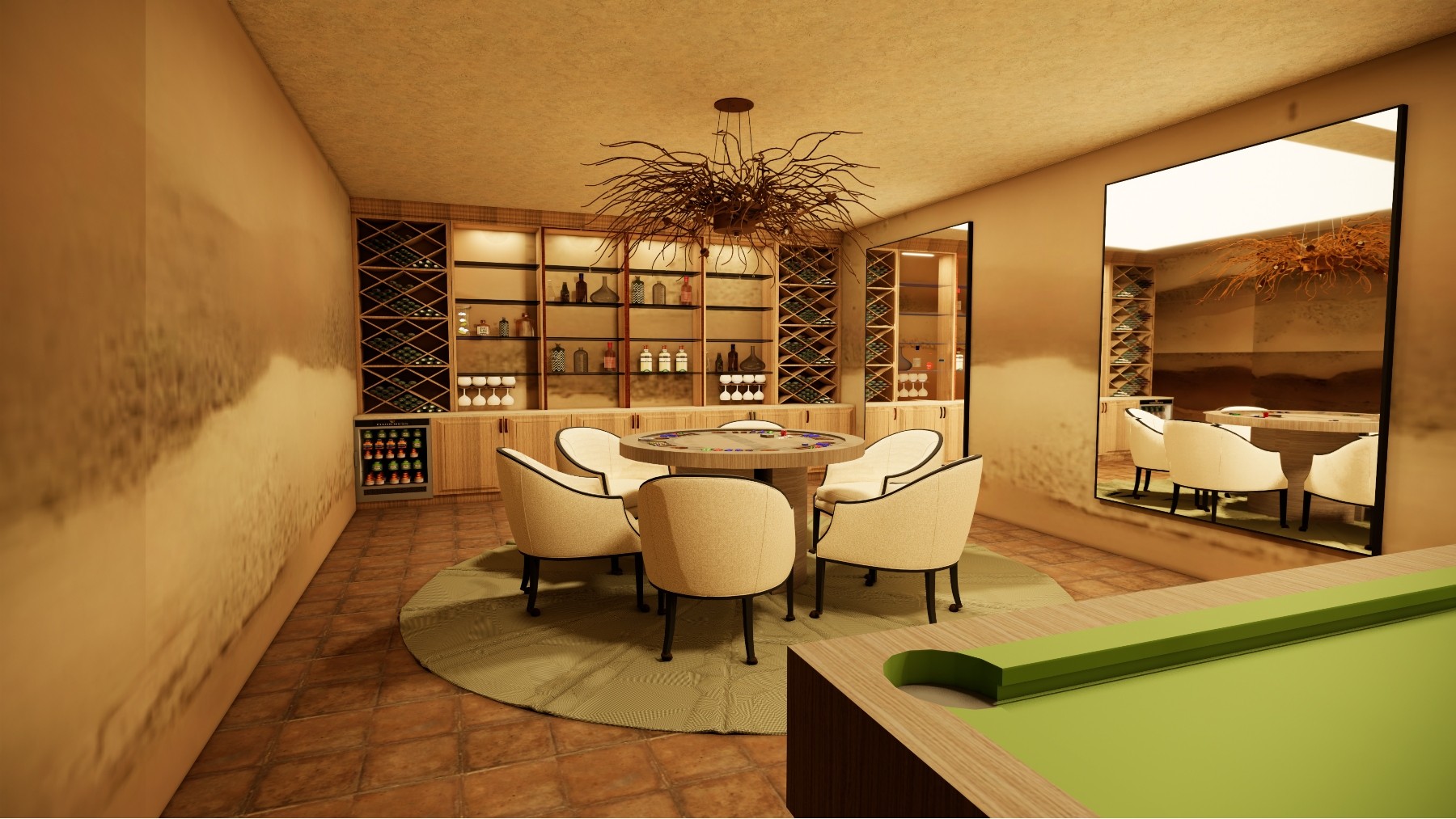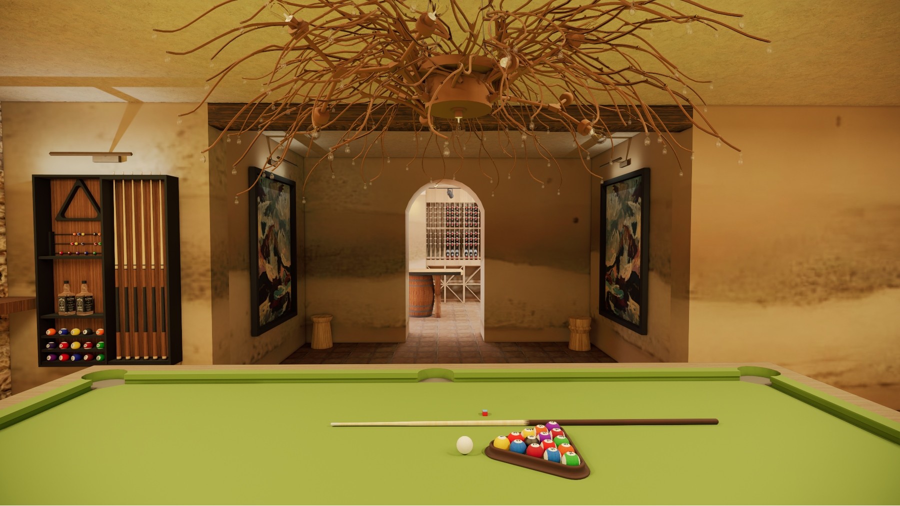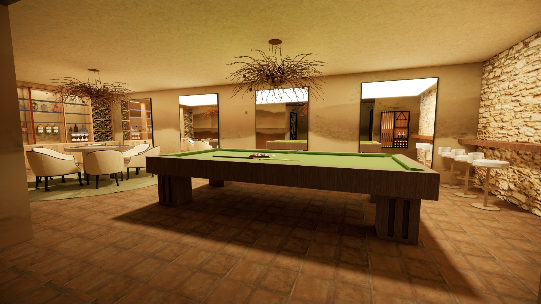 Tucked into the hillside is a vaulted cellar, cool, curved, and calm. A place for wine, for stories, for time. Beside it, a games room offers a playful contrast: table tennis, music, echoing joy.