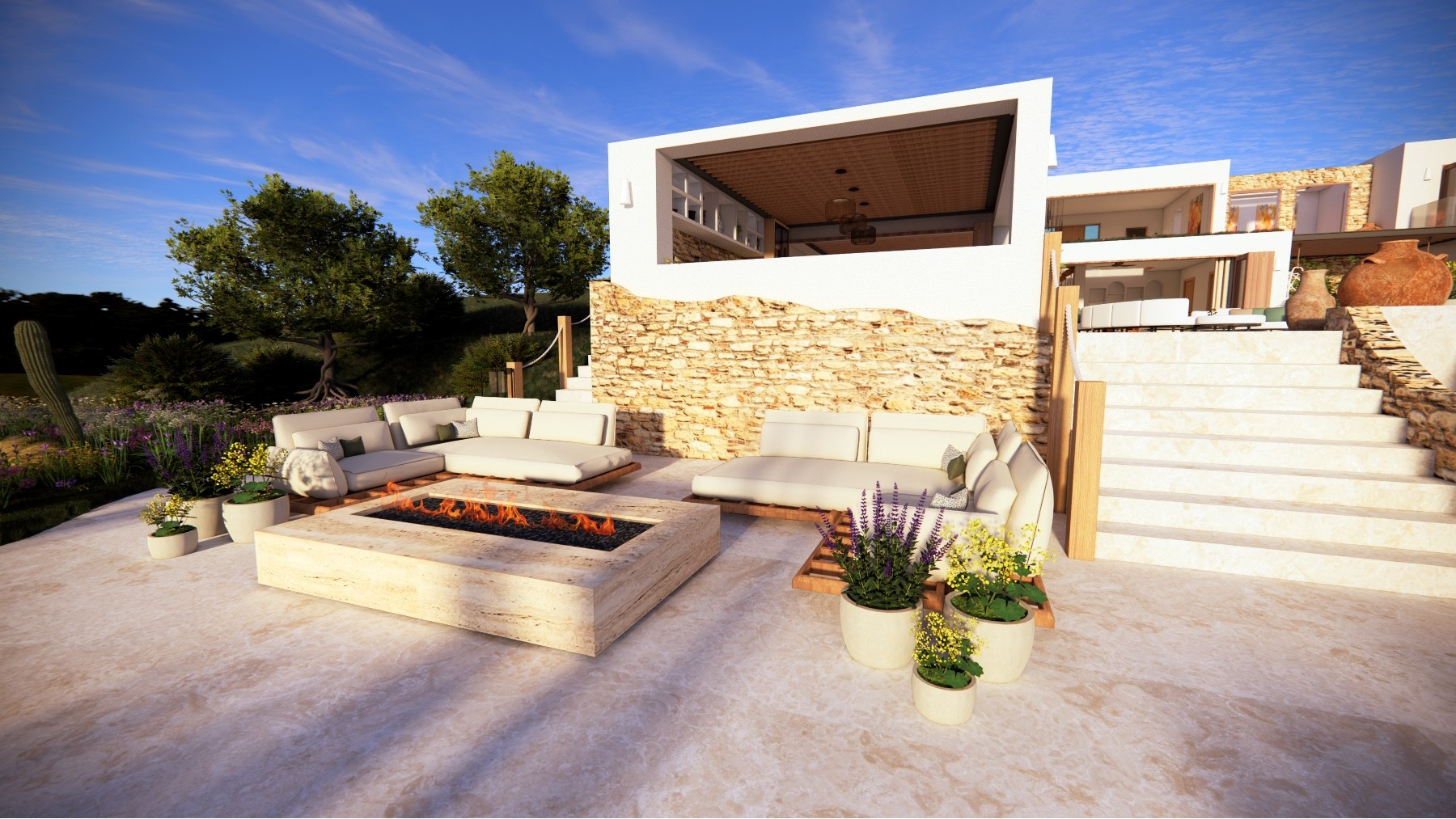 At the lowest terrace, the house becomes part of the terrain. Here, stone gives way to garden. Courtyards invite play and laughter. A fire pit is encircled by wild grasses and soft seating. Lounge areas feel sculpted from the landscape itself.