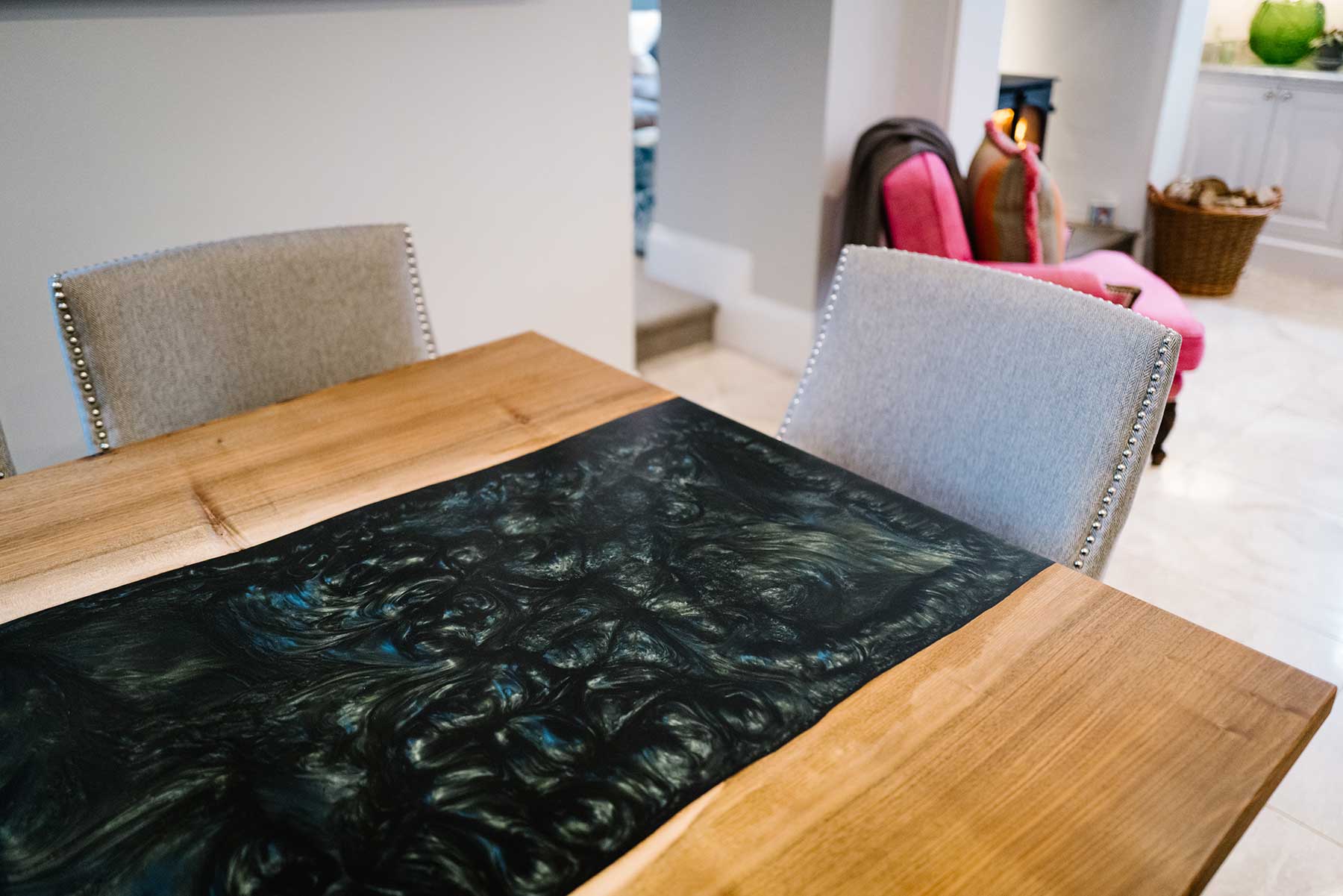 As well as a making each table completely unique, it’s our goal for them to be loved and enjoyed by our client, and their family and guests. Each table is finished with durable hard wax oil, which is child and pet safe as well as packed full of natural oils that bring out the exceptional beauty in the wood grain. It also makes the resin pop!