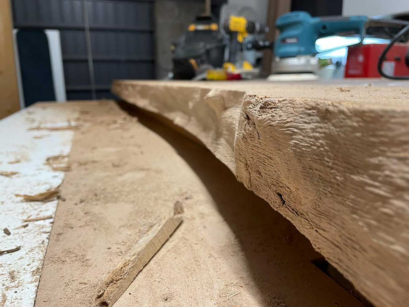 These edges often retain bark and other loose materials. These must be removed in order to correctly bond the resin to the wood. This is achieved using chisels and wire brushes to get a smooth, clean and naturally-shaped surface. The surface of the walnut also gets checked for any other voids that may have loose material and need to be cleaned out, mostly using dentistry tools.