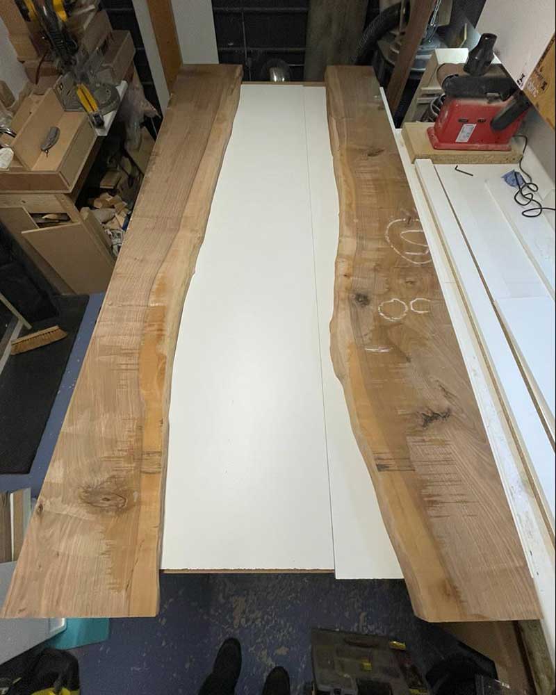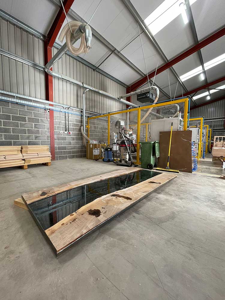 I prepared a mould to hold the wood and resin together. Then the walnut arrived at the workshop and was carefully checked over and assessed for the best place to cut. The natural river shape is dictated by the shape of the tree’s outside face, called the live edge. It’s one of the aspects that gives each table a totally unique appearance.